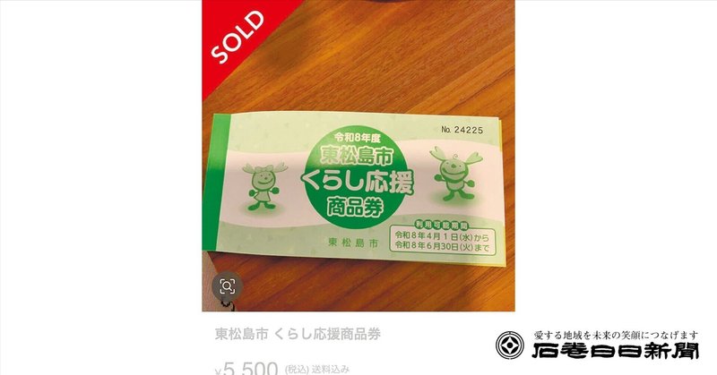 東松島市が物価高騰対策の一環で全市民に無料配布した「東松島市くらし応援商品券」が、インターネットの大手フリーマーケットサイトに出品・転売されていたことが27日までに分かった。【山口紘史】