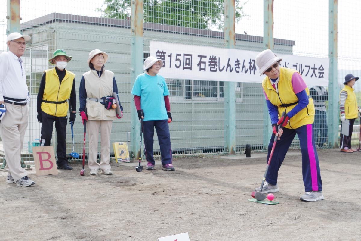 石巻信用金庫主催の「第15回石巻しんきん杯グラウンドゴルフ交歓大会」が7日、石巻市の追波川河川運動公園で開かれた。石巻市と女川町から参加した選手たちと同庫職員計約130人が、爽やかな青空のもとで心地よい汗を流した。