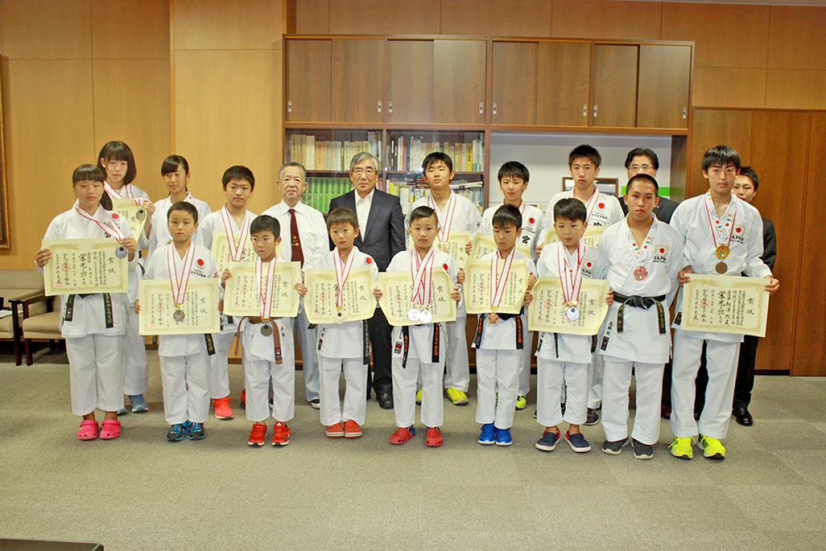 「文部科学大臣杯第60回小学生・中学生全国空手道選手権大会」と「船越義珍杯第14回少年世界空手道選手権大会」に出場した日本空手協会石巻地区協議会に所属する小中学生たちが1日、石巻市役所を表敬訪問した。