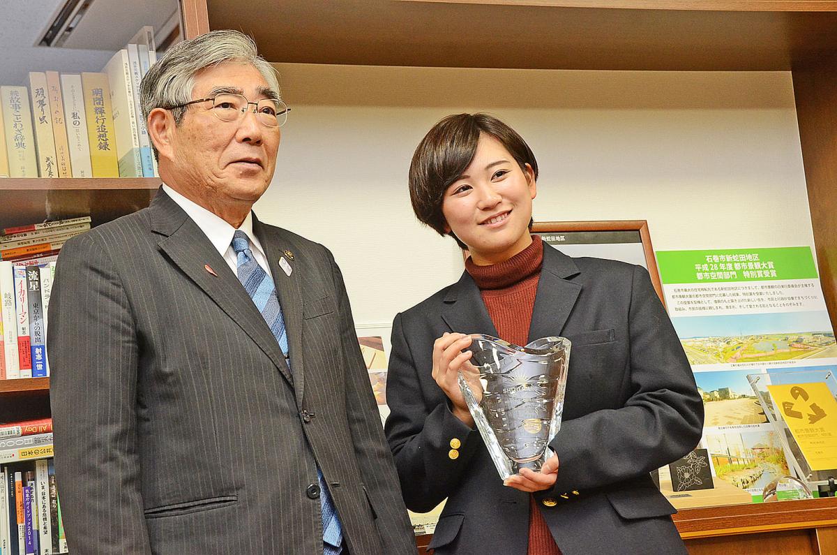 石巻市 スポーツ 石巻日日新聞 2017年10月25日(水) 15時22分石巻市出身で茨城県の明秀学園日立高校に通う平塚新夢さん(3年)が18日に石巻市役所を訪れ、今年5月に行われたLPGA(日本女子プロゴルフ協会)ステップ・アップ・ツアー第5戦「静ヒルズレディース森ビルカップ」の優勝を亀山紘市長に報告した。プロも出場する大会でアマチュアとしては史上5人目の快挙であり、高校卒業後は地元に戻ってプロを目指すことも表明した。