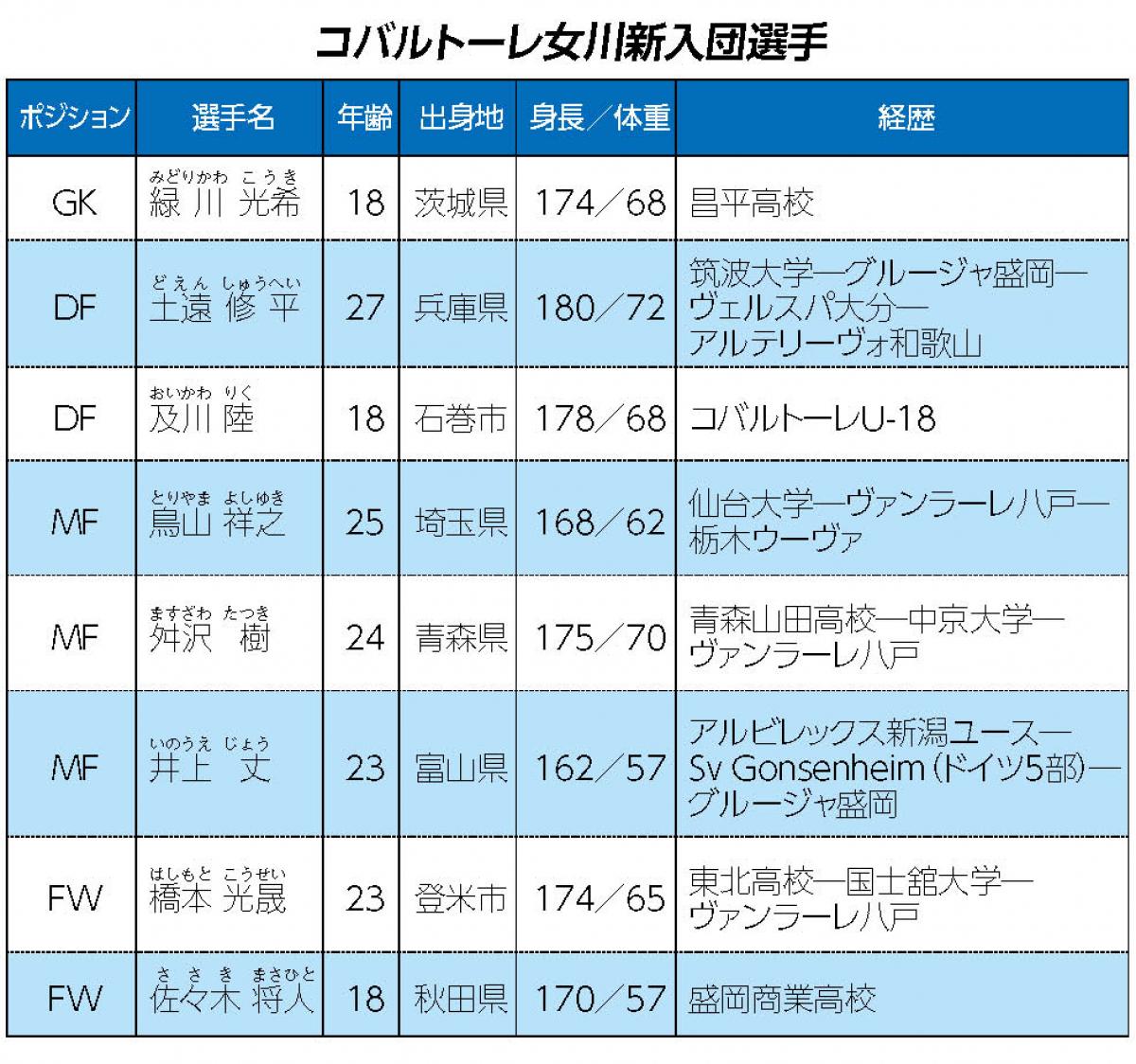新シーズンからJFL(日本フットボールリーグ)に参戦するコバルトーレ女川は、すでに公表しているMF鳥山祥之選手(25)とFW橋本光晟選手(23)の2人に加え、新たに入団する6選手を23日までに発表した。