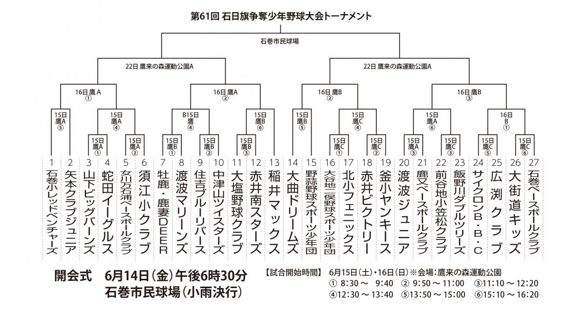 今年は昨年より1チーム多い27チームが出場。注目は昨年の石日旗優勝チームで、今年のヤッくん杯も制した石巻小レッドベンチャーズ、成熟したバッテリーを置く大谷地二俣野球スポ少、守備力に定評のある牡鹿・鹿妻DEERなど。力のある選手をそろえる大街道キッズ、前谷地小笠松クラブ、大曲ドリームズも上位をうかがう。