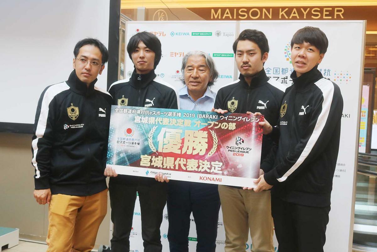 テレビゲームをスポーツや競技として極める「eスポーツ」に取り組む「e―cobaltore(イーコバルトーレ)」は3日、10月に茨城県である国体に宮城県代表として出場する権利を勝ち取った。同日、仙台市で開かれた代表決定戦でつかんだ優勝であり、選手兼監督の佐竹司さん(36)=東松島市=は「全国の舞台で結果を残し、女川の名を刻みたい」と国体での勝利を誓った。