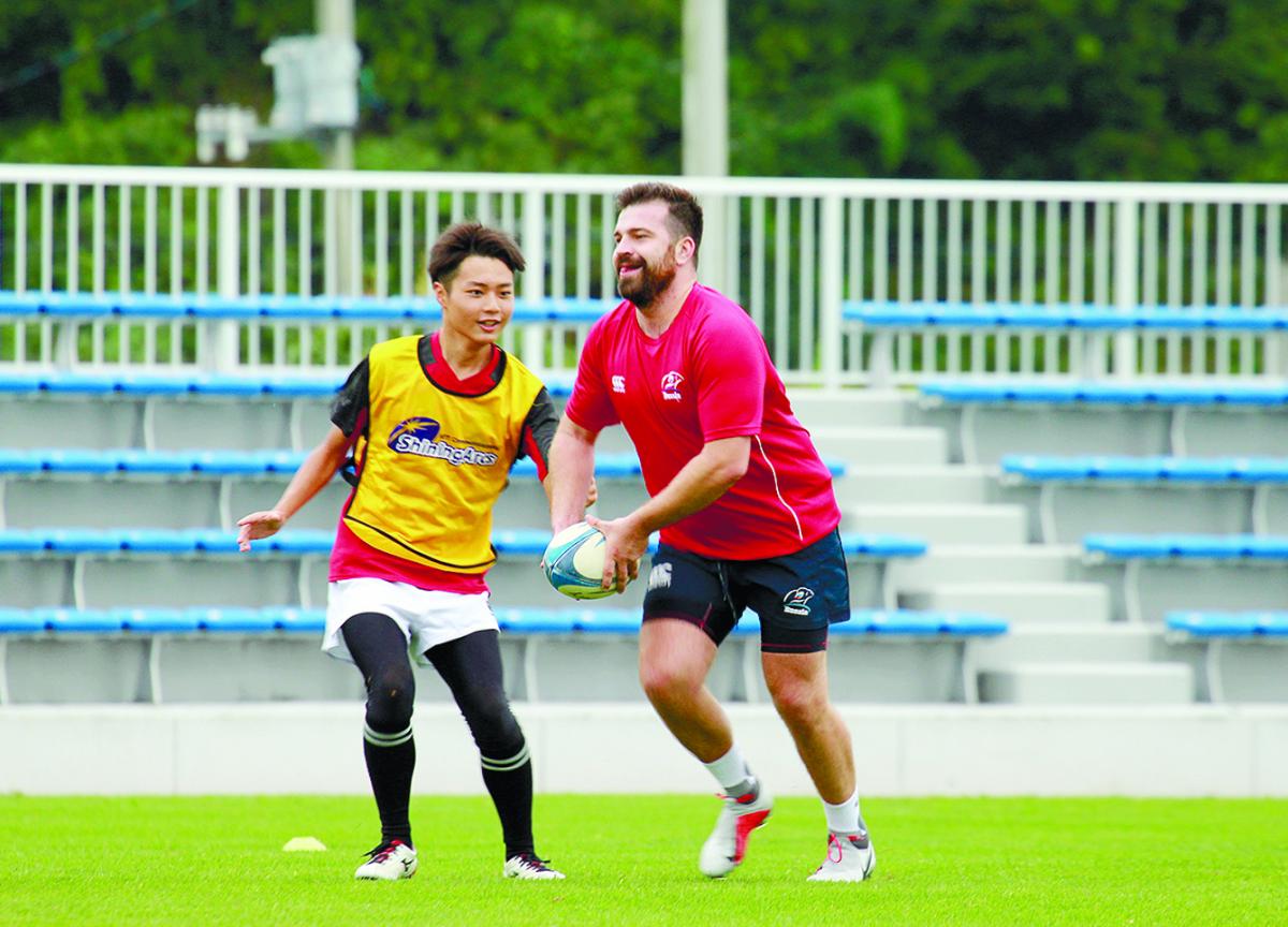 このうちロシア連盟の役員で元代表選手のグレブ・バプキンさんとオレグ・ブカロフさんは、高校生を対象に指導会を実施。パスやタックルなど基本を教えたほか、タッチラグビーで交流を深めた。