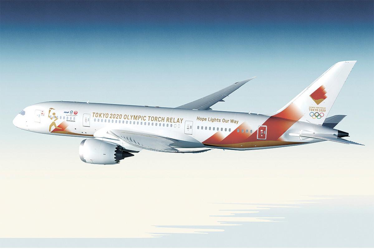 ギリシャからの聖火の輸送には、日本航空(JAL)と全日本空輸(ANA)が共同運航する特別輸送機「TOKYO 2020号」を使用。国内大手2社が共同運航するのは史上初めてで、両社のロゴが並ぶ珍しい機体となる。機体の前方には聖火ランナーのピクトグラム(絵文字)が施され、後方の垂直尾翼にかけて聖火の赤い炎が描かれる。