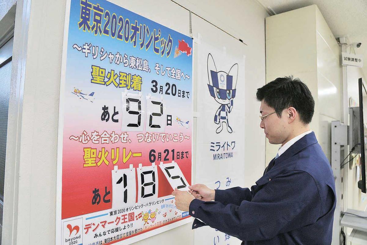 来年の東京五輪・パラリンピックに向けて機運を高めるため、東松島市は本庁舎1階ロビーに聖火到着式(3月20日)と聖火リレー通過日(6月21日)までの残り日数を示すカウントダウンポスターを設置した。